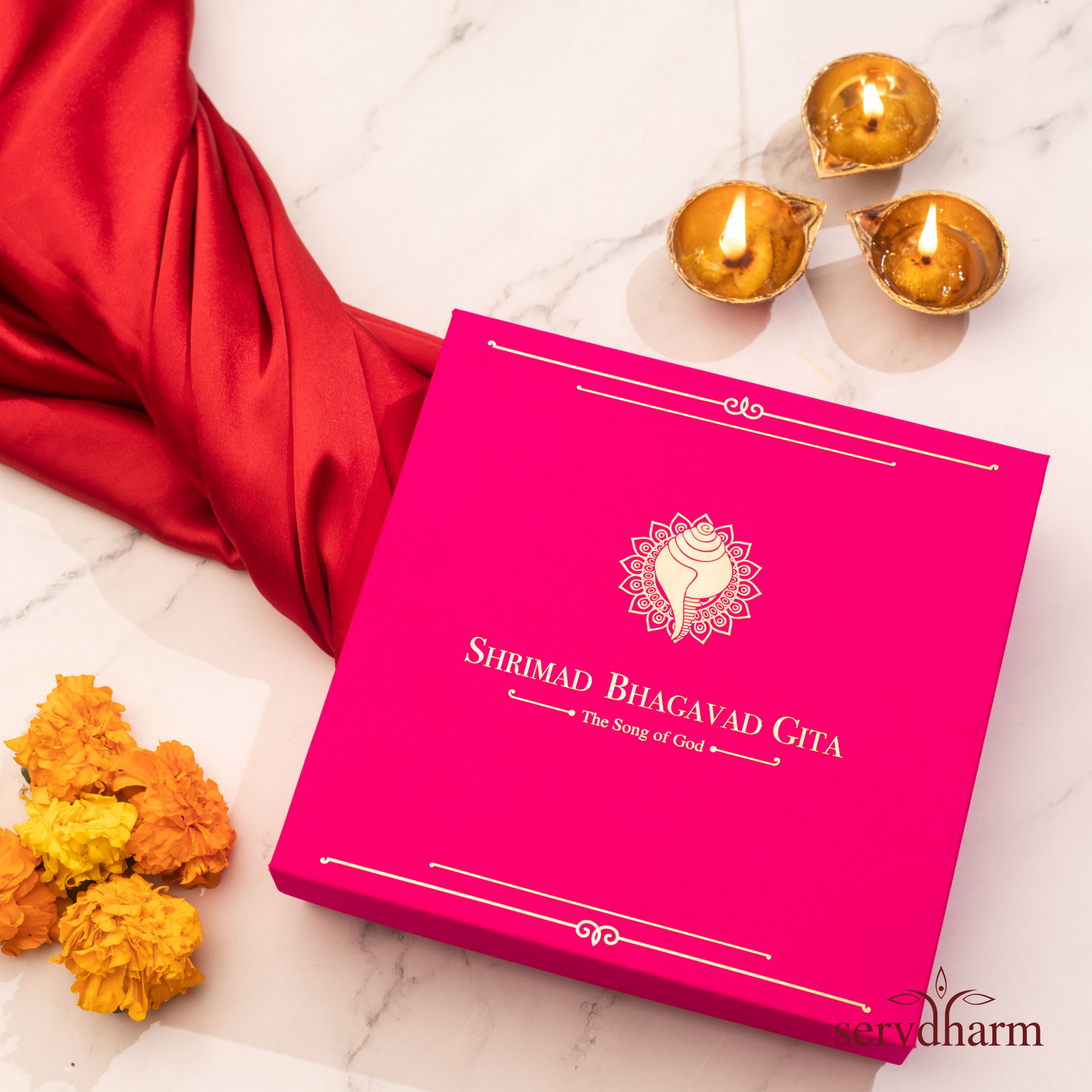 The Srimad Bhagavad Gita is considered to be a timeless guide for life. Its relevance even in present times offers its readers clarity in confusion, strength in adversity, and calm in chaos. This luxurious edition by ServDharm brings to life the sacred dialogue between Shri Krishna and Arjuna, giving the readers a unique experience.